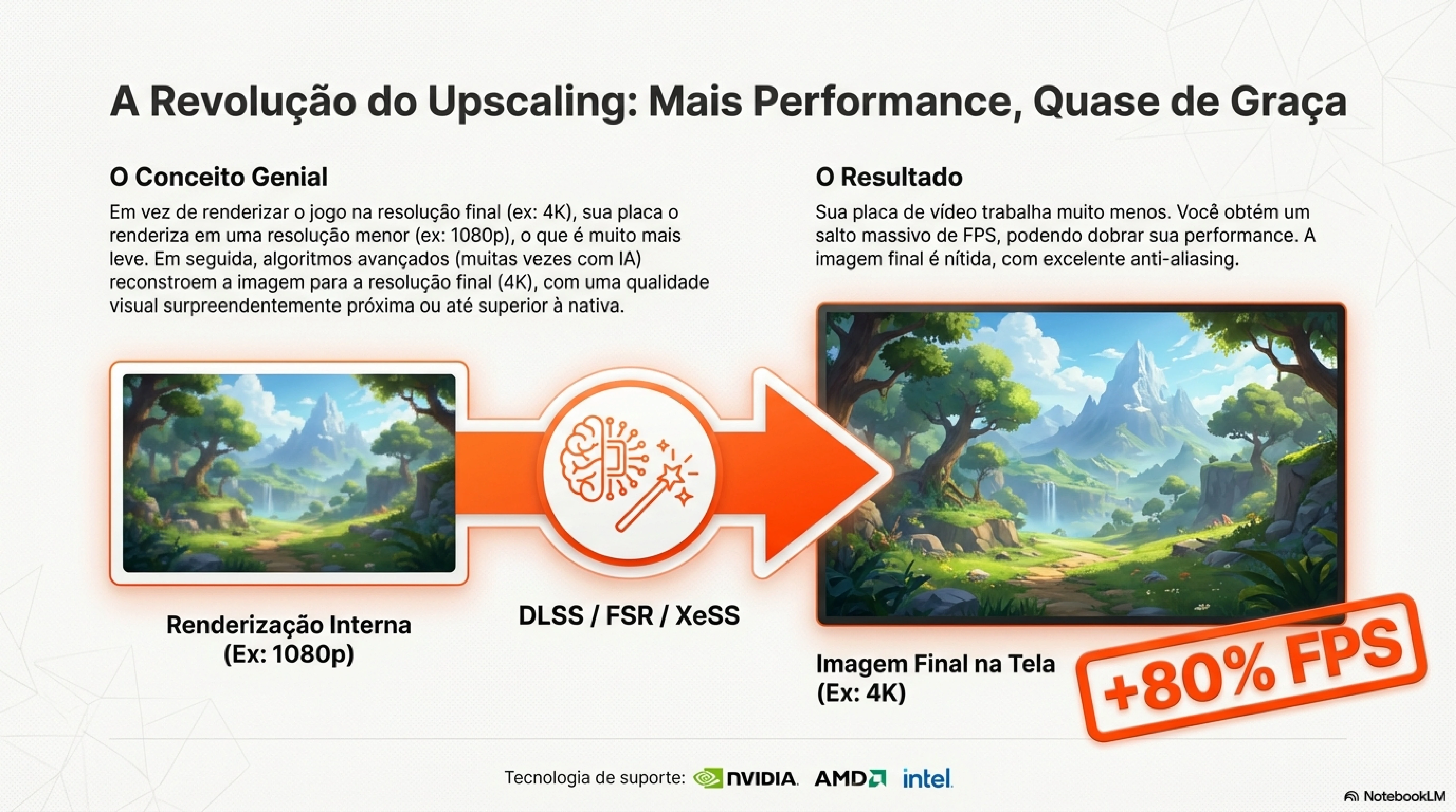 A ideia central é genial. Em vez de sua placa de vídeo renderizar o jogo em 4K (que é extremamente pesado), o DLSS renderiza em uma resolução menor como 1440p ou até 1080p. Depois, usa algoritmos de IA treinados em supercomputadores para reconstruir a imagem em 4K com qualidade próxima ou até superior ao nativo.