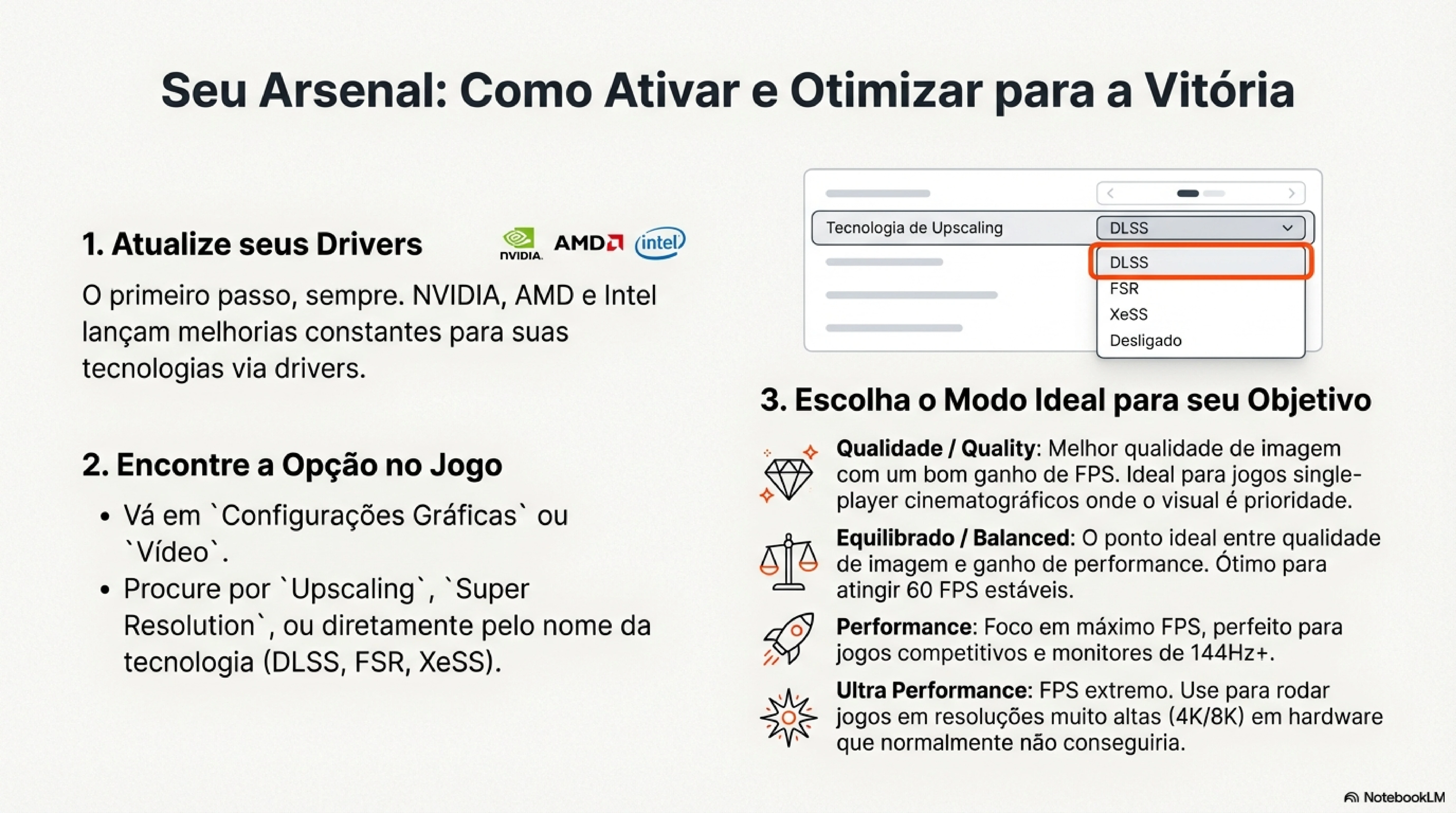 Ultra Quality: Mínima redução de resolução interna. Ganho menor de FPS (25-35%) mas qualidade praticamente idêntica ao nativo.