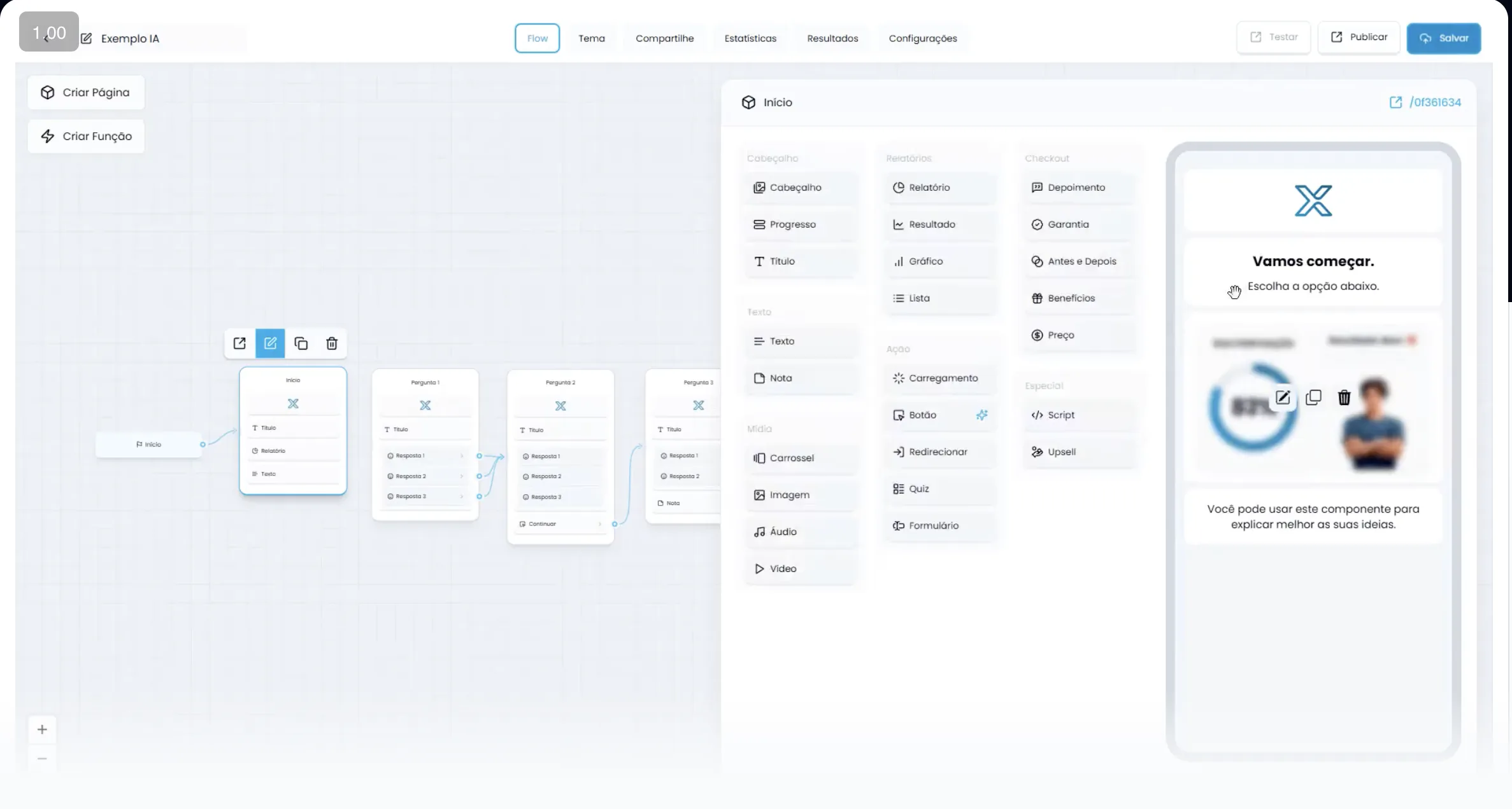 Você acessa a plataforma, escolhe entre mais de 25 elementos interativos disponíveis (perguntas de múltipla escolha, campos de texto, vídeos, botões, condicionais, etc.) e monta seu funil simplesmente arrastando blocos para a tela. É como montar um quebra-cabeça visual.
