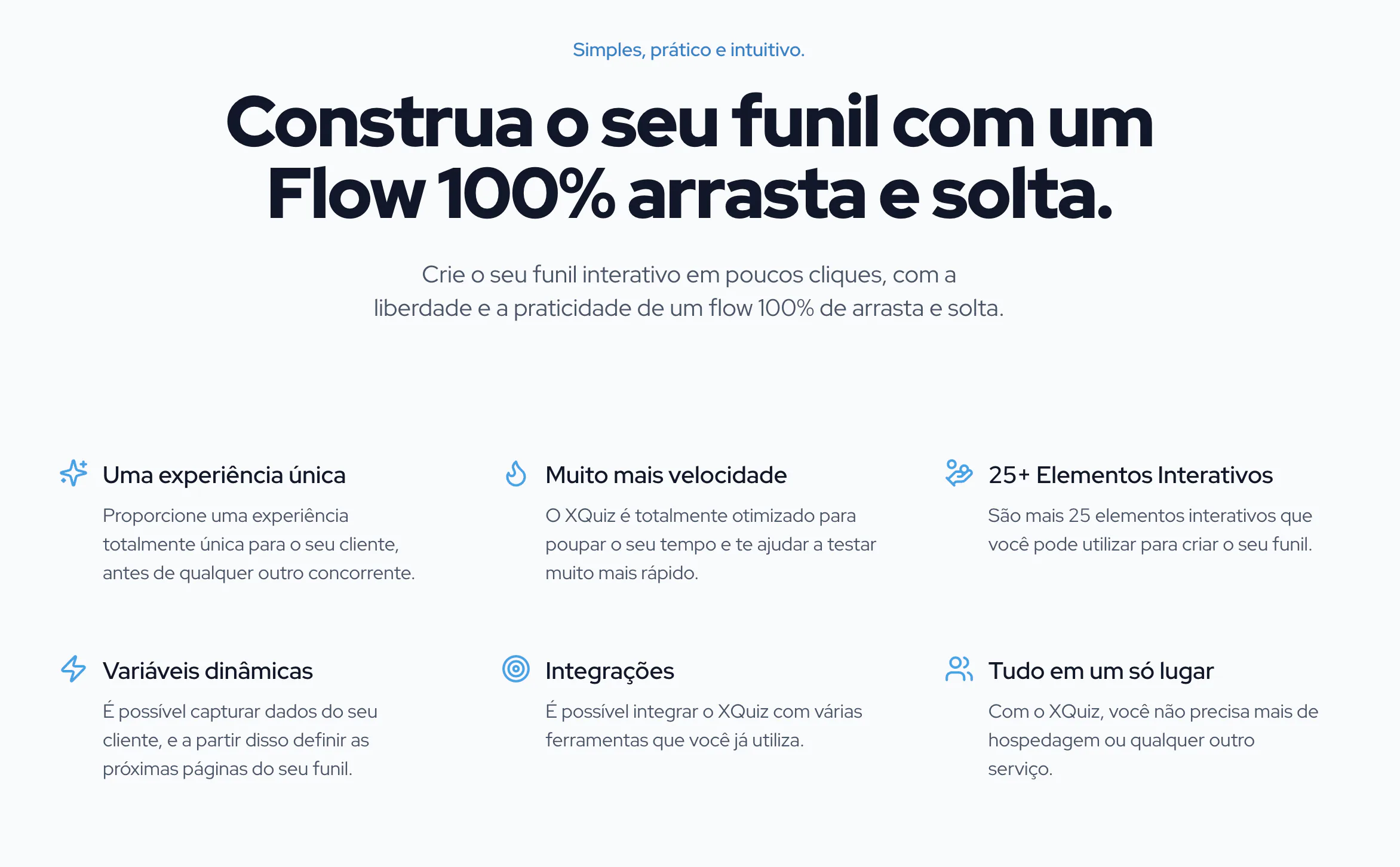Como o XQuiz resolve: O sistema 100% visual arrasta-e-solta permite que você mesmo crie, edite e publique funis completos em minutos, sem escrever uma única linha de código. Quer testar 5 variações diferentes do mesmo quiz? Faz isso em uma tarde sozinho. Essa autonomia e velocidade são fundamentais para descobrir rápido o que funciona e escalar apenas o vencedor.