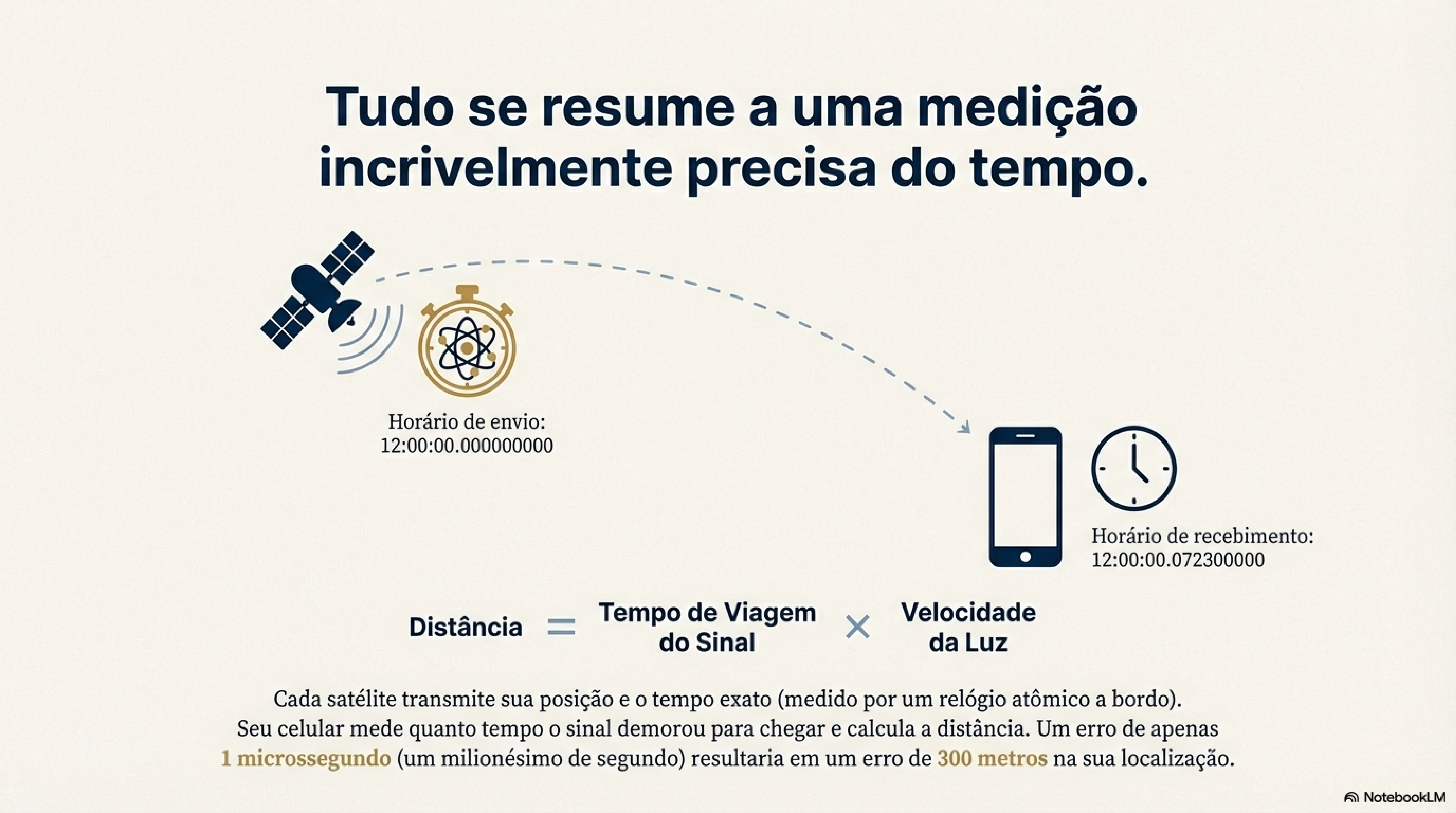 Quando seu celular recebe o sinal, ele compara o horário de envio com o horário de recebimento. A diferença revela quanto tempo o sinal levou para chegar. Multiplicando esse tempo pela velocidade da luz, o receptor calcula a distância até o satélite.