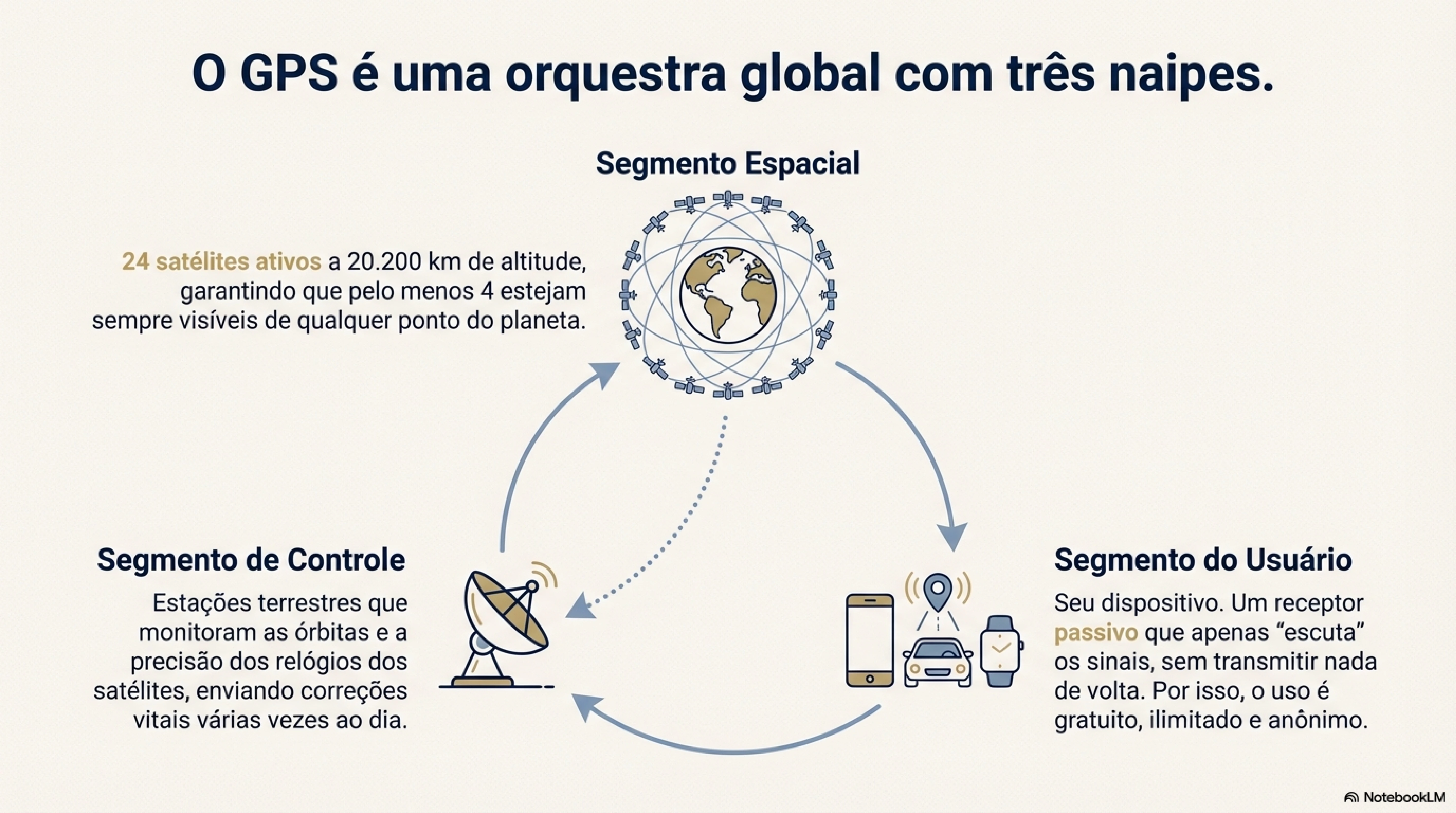 O GPS não é apenas satélites no espaço. O sistema completo possui três componentes trabalhando em conjunto: