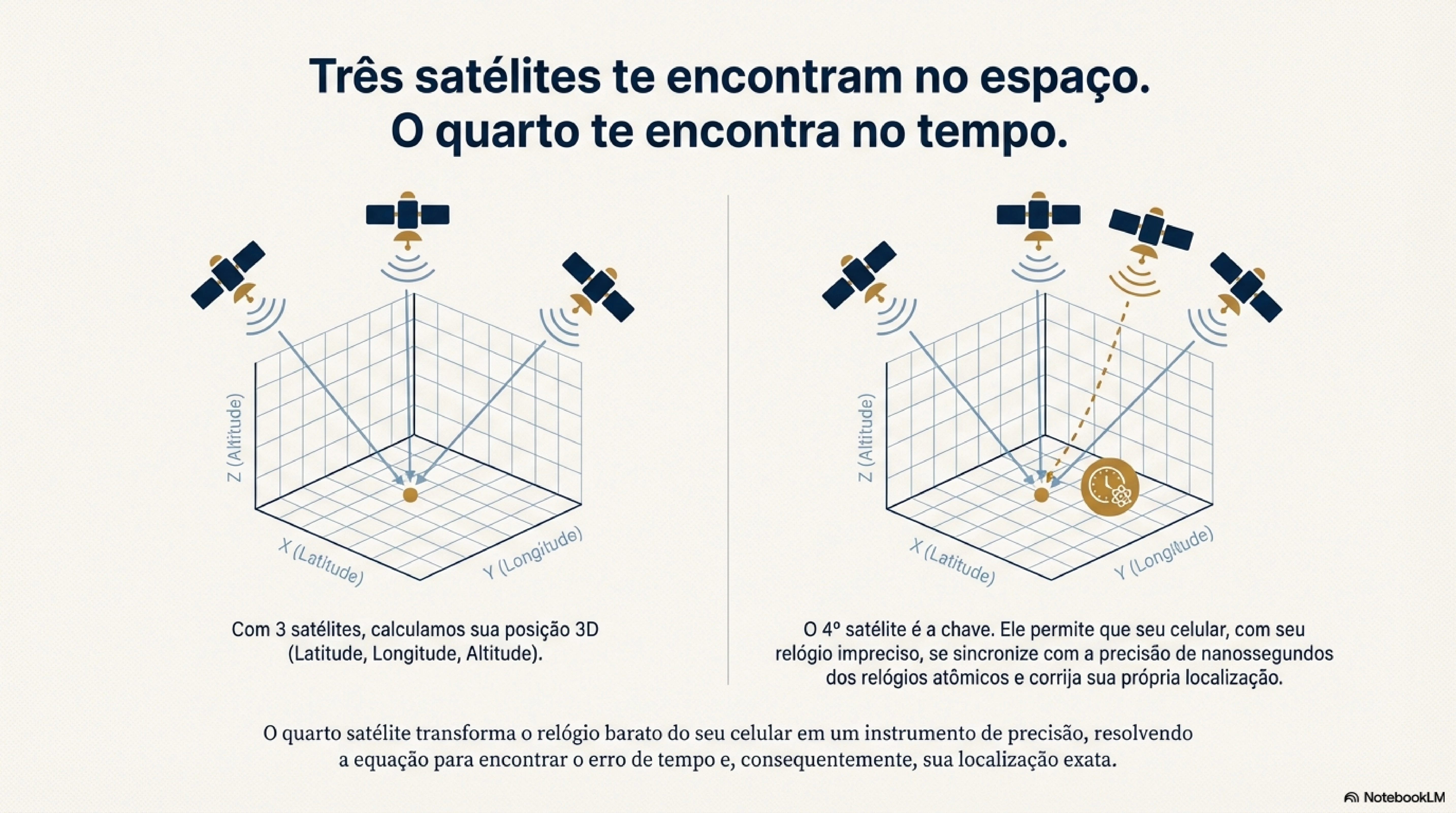 Com quatro equações (uma para cada satélite) e quatro incógnitas (latitude, longitude, altitude e erro de relógio), o sistema resolve tudo simultaneamente.