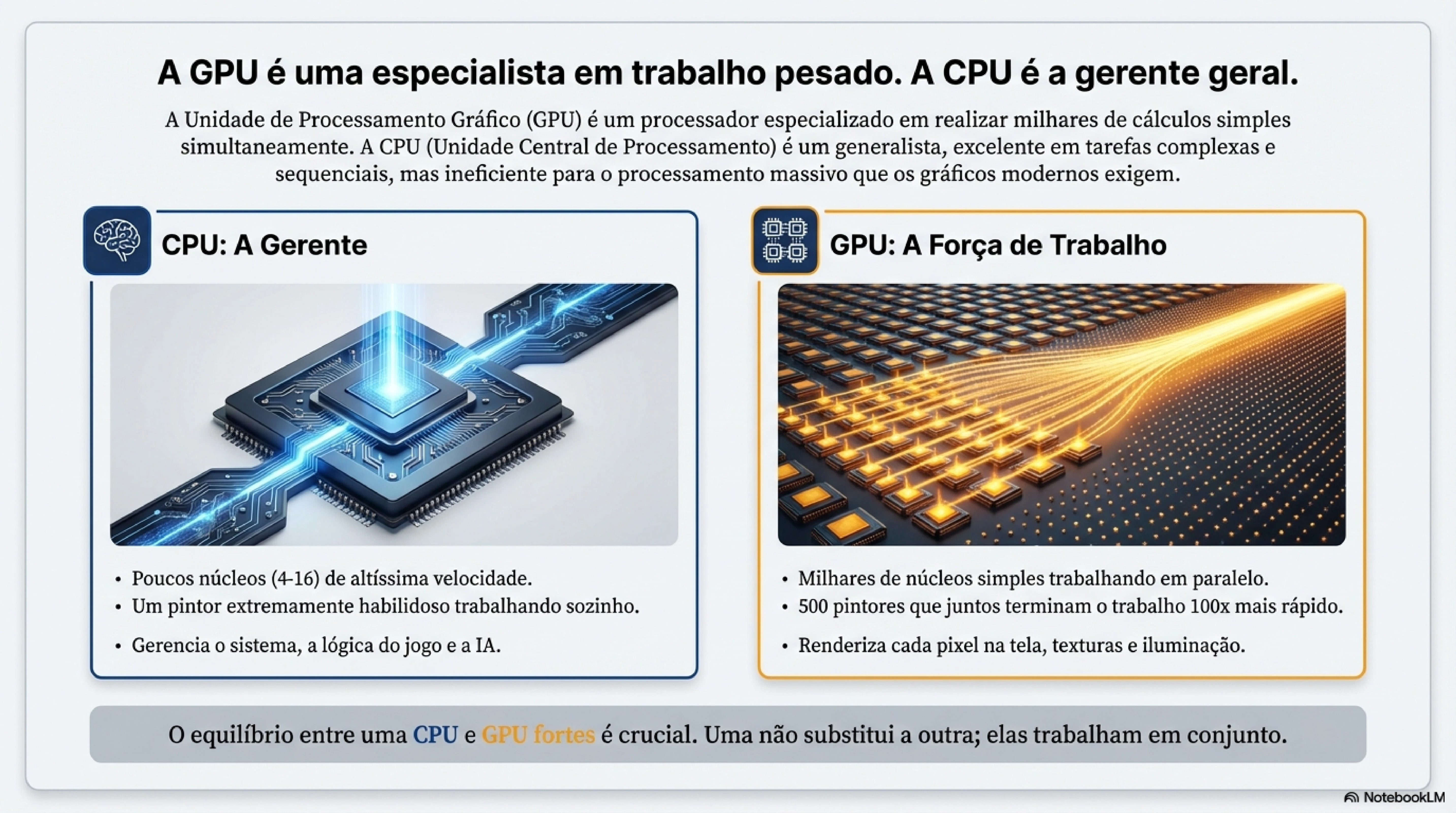 Muita gente confunde GPU e CPU ou acha que uma substitui a outra. A verdade é que eles trabalham juntos, cada um com sua especialidade.
