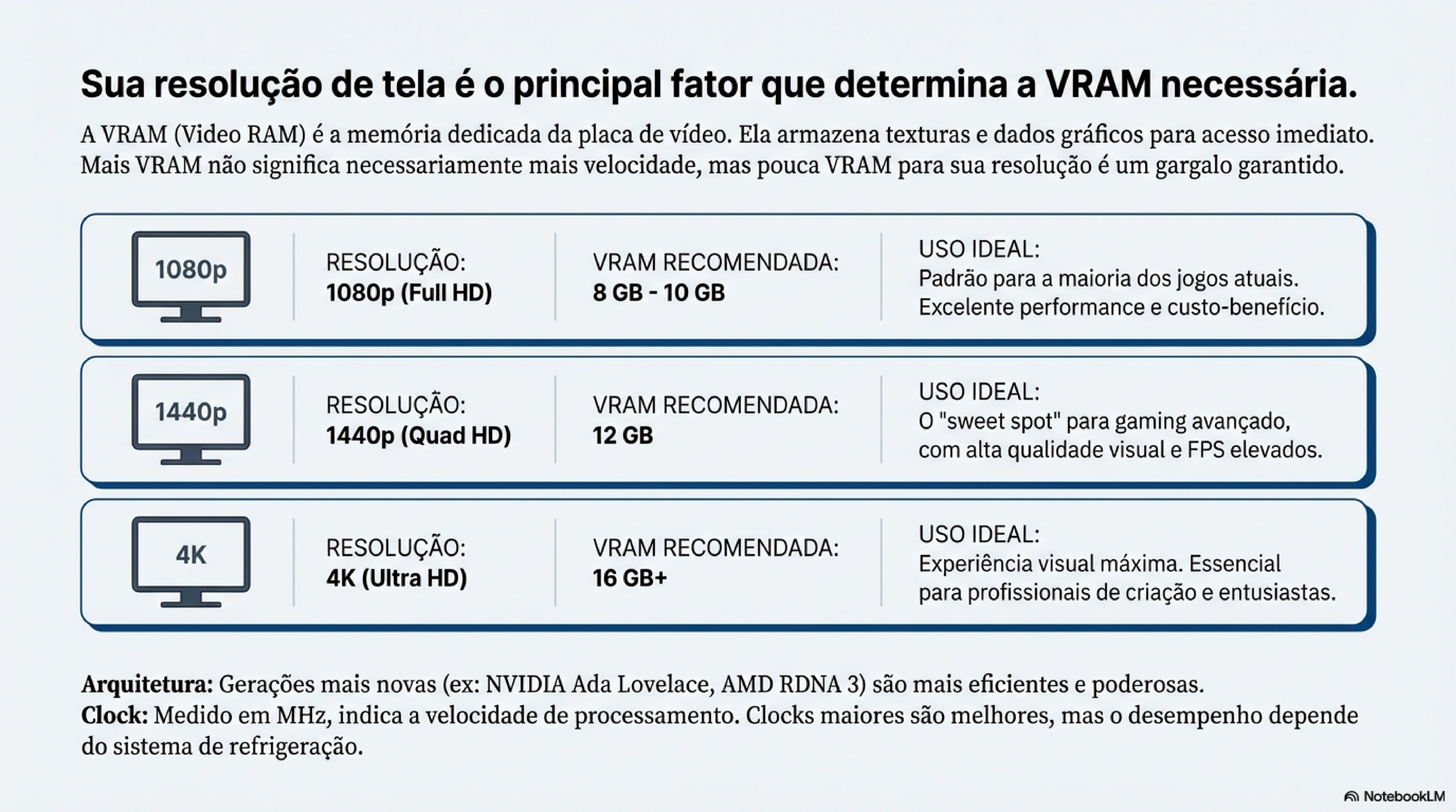 1440p (Quad HD) | 8GB | 12GB | Gaming avançado, criação de conteúdo |