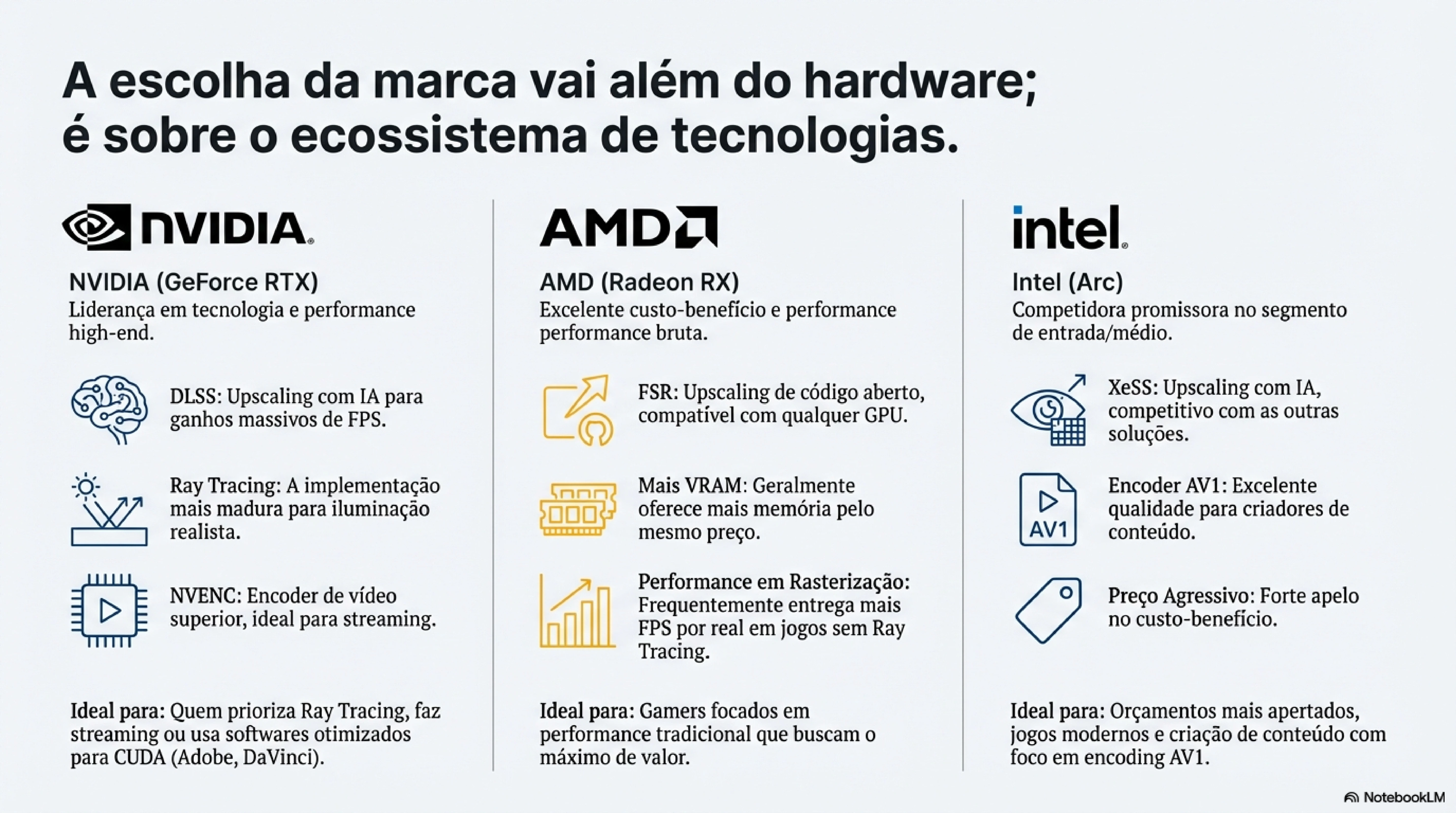 Escolha NVIDIA se: Quer a melhor tecnologia disponível, joga com Ray Tracing, faz streaming profissional ou usa software que se beneficia de CUDA.