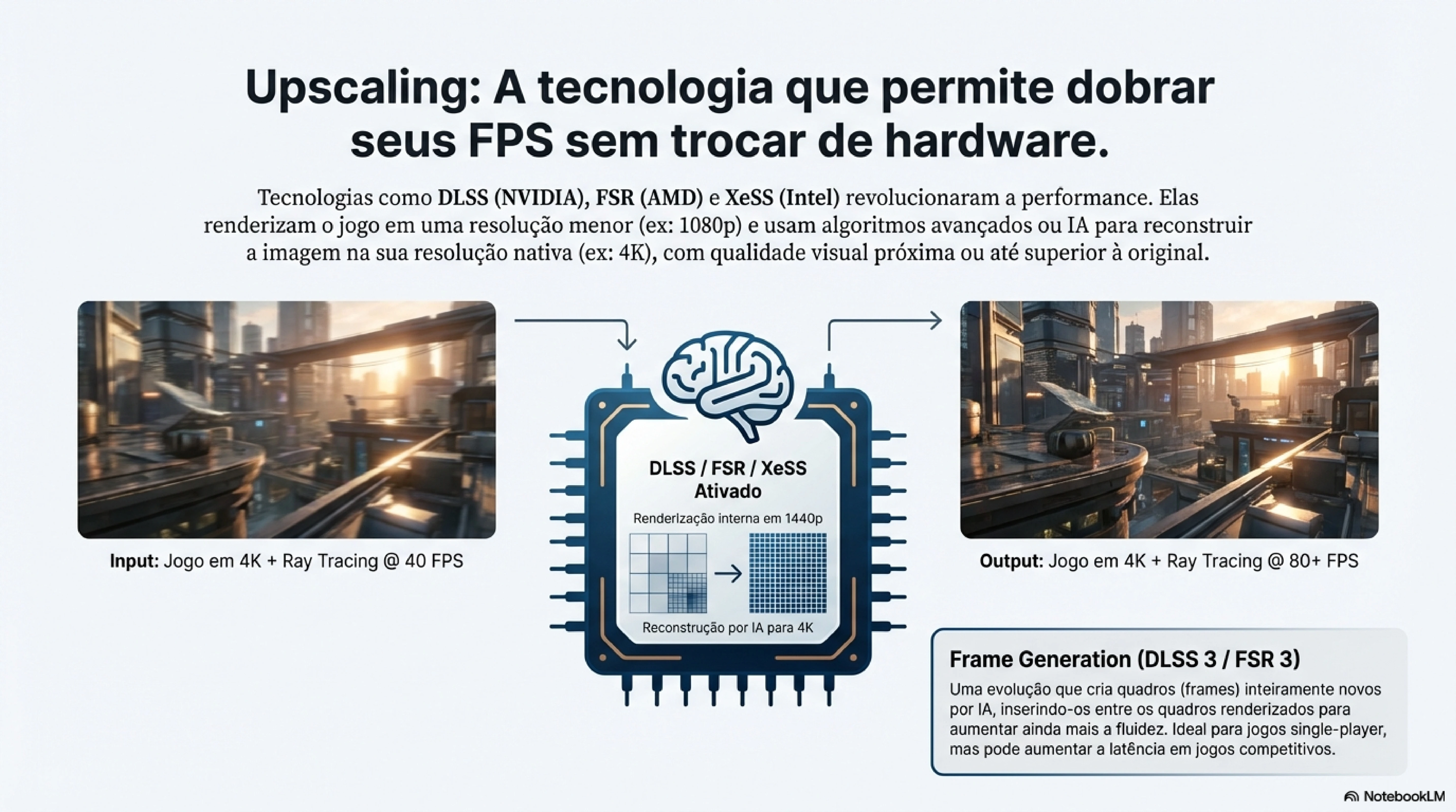 Por isso existem tecnologias de upscaling que compensam essa perda, mantendo qualidade visual alta com impacto menor na taxa de quadros.