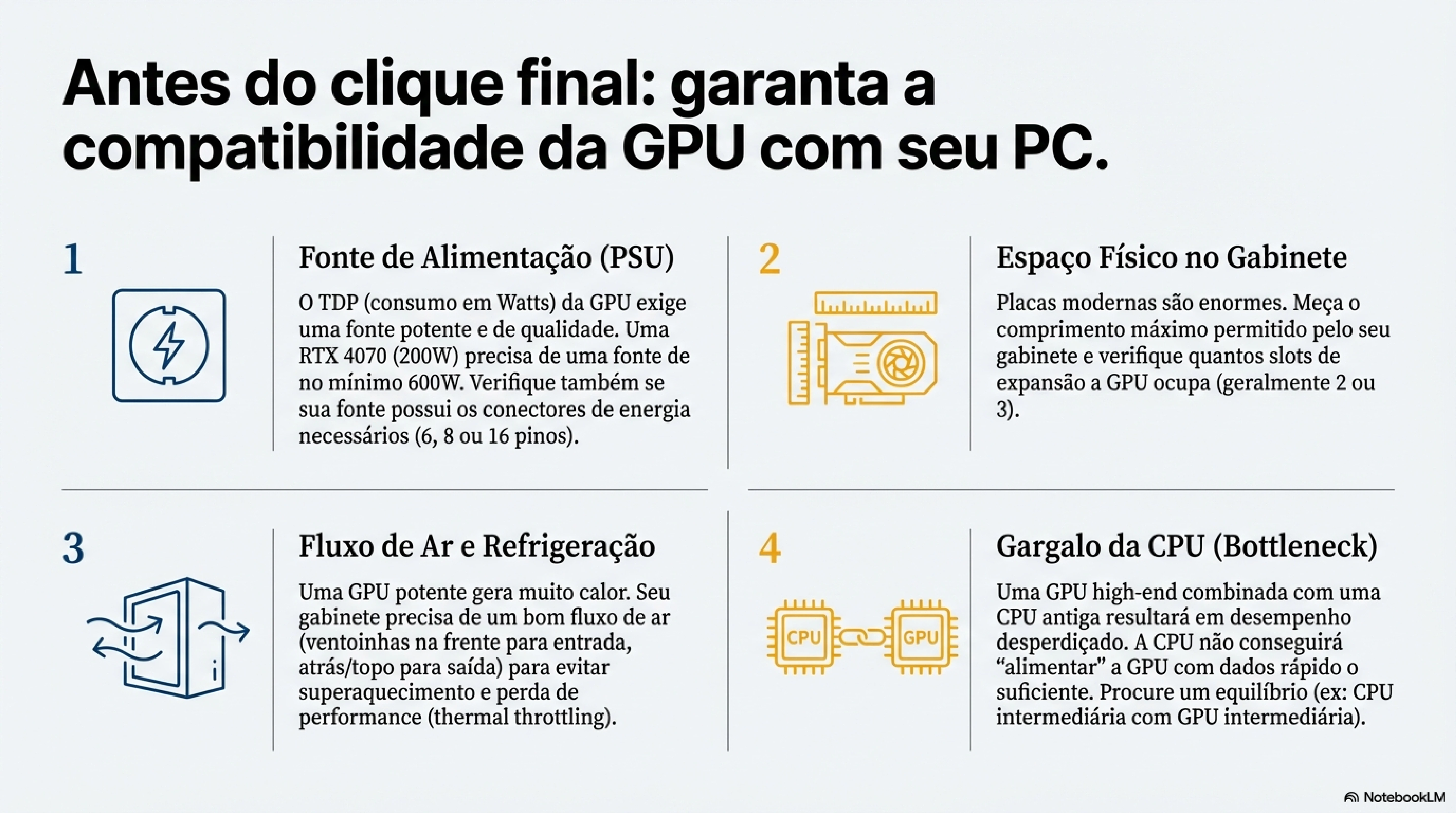 GPUs modernas geram muito calor. Se seu gabinete não tem ventilação adequada, a placa vai superaquecer e reduzir performance automaticamente (thermal throttling).