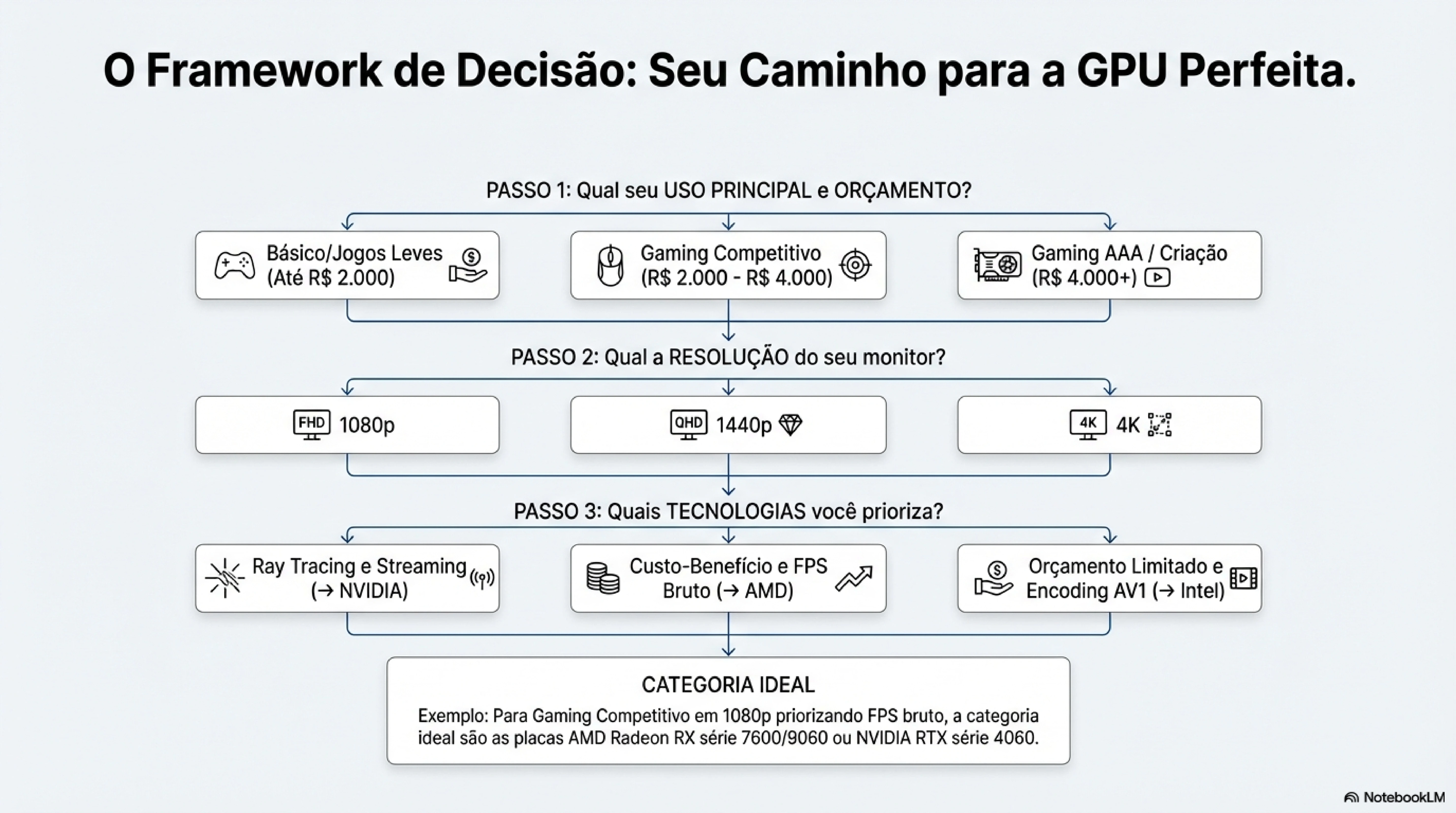 Os três fatores que realmente importam são: resolução que você vai jogar, tipo de trabalho que faz e orçamento disponível. Com essas informações claras, você consegue encontrar o equilíbrio perfeito entre performance e investimento.