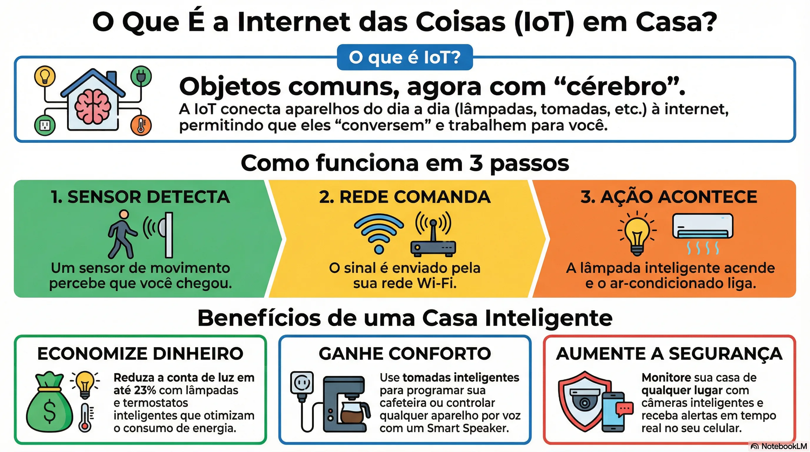 Internet das Coisas é quando objetos comuns ganham "cérebro" e se conectam à internet. Eles coletam informações, conversam entre si e tomam decisões sozinhos para facilitar sua vida.